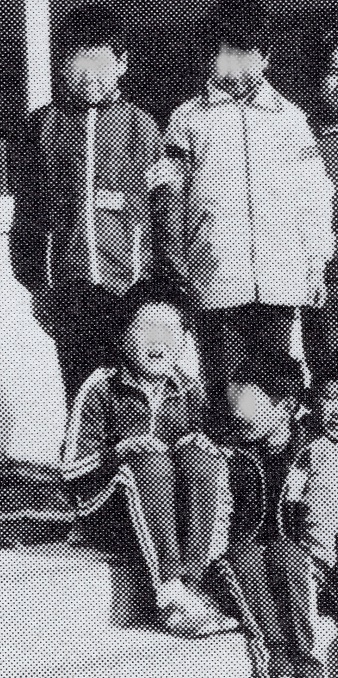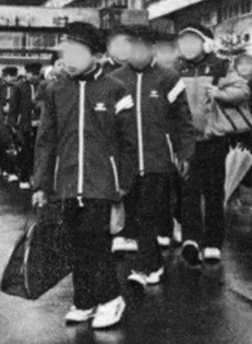 右奥の子は三角襟の付いたナイロンジャンバー(ノーブランド)で両腕に3本線が入る